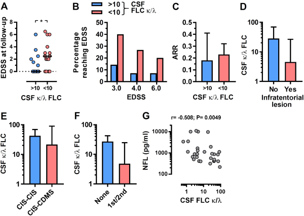 Cerebrospinal fluid (CSF) κ:λ free light chain (FLC) ratio predicts disability accumulation in multiple sclerosis (MS). (A) Expanded disability status scale (EDSS) at 5-year follow-up (following diagnostic lumbar puncture; where available) for high (>10) and low (<10) CSF FLC κ:λ ratio groups (n=15 and n=14, respectively); Mann-Whitney test; *p<0.05. The percentage of individuals reaching (B) EDSS 3.0, 4.0 or 6.0, (C) annualised relapse rates (ARR), (D) the presence of infratentorial lesions, (E) those remaining at clinically isolated syndrome (CIS) (CIS–CIS) or converting to clinically definite MS (CIS–CDMS) and (F) those requiring physician determined first-line or second-line therapy are shown for the high and low CSF κ:λ ratio groups. (G) Correlation between CSF neurofilament light chains and immunoglobulin FLC κ:λ ratios; Spearman correlation.