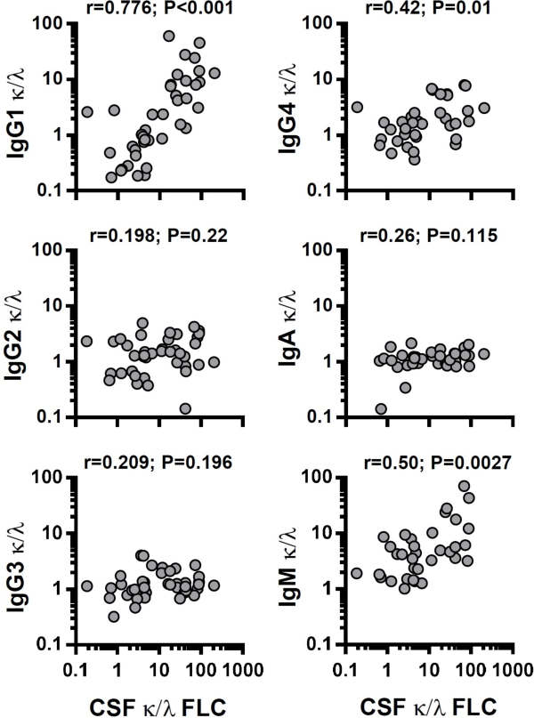 Correlation between cerebrospinal fluid (CSF) free light chain (FLC) and intact immunoglobulin κ:λ ratios. Correlations are shown between CSF FLC κ:λ ratio and the κ:λ ratio of CSF immunoglobulin (Ig)G1, IgG2, IgG3, IgG4 and IgM; Spearman correlations.