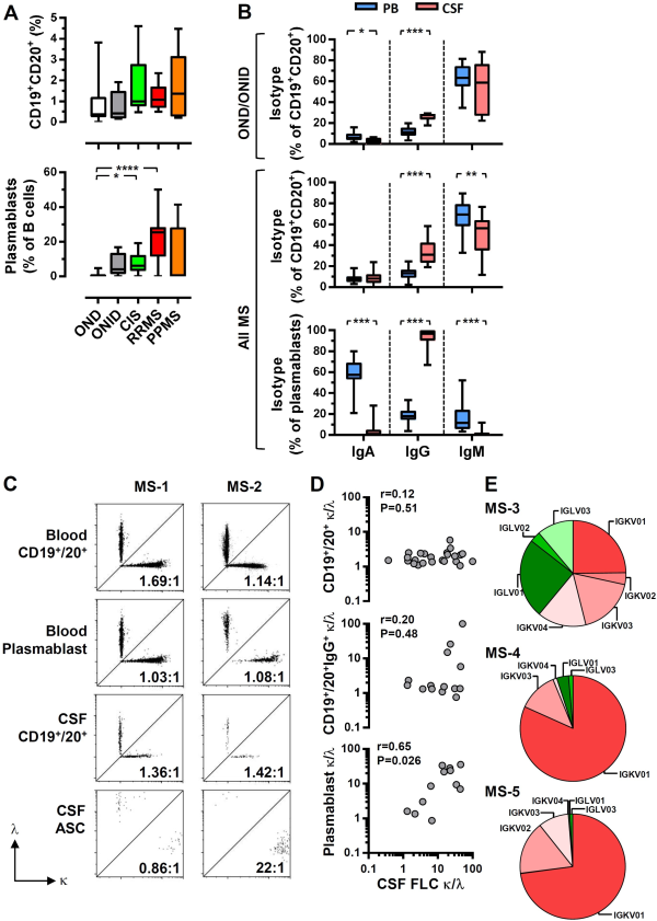 The bias to κ light chain usage is intrinsic to cerebrospinal fluid (CSF) plasmablasts. (A) The frequency of B cells (CD19+ and CD20+) and plasmablasts (according to the gating strategy in the online Supplementary figure e1) was determined for clinically isolated syndrome (CIS), relapsing-remitting multiple sclerosis (RRMS), primary-progressive multiple sclerosis (PPMS), other neurological diseases (OND) and other neurological inflammatory diseases (ONID). (B) For CSF and matched peripheral blood samples, immunoglobulin (Ig)A, IgG and IgM isotypes were determined on both CD19+ CD20+ B cells and plasmablasts. Kruskal-Wallis with Dunn’s post-test; ***p<0.001; **p<0.01; *p<0.05, all other comparisons non-significant (p>0.05). The frequency of κ-expressing and λ-expressing total B cells, IgG+ B cells and plasmablasts was determined by flow cytometry (C; representative plots for CIS (MS1) and RRMS (MS2)) and correlated with the CSF free light chain (FLC) κ:λ ratio (D); Spearman correlations. (E) The frequency of each Immunoglobulin Kappa Variable (IGKV); red and Immunoglobulin Lambda Variable (IGLV); green) gene segments was determined from the cDNA of CSF cells for MS3 (PPMS), MS4 (CIS) and MS5 (CIS).