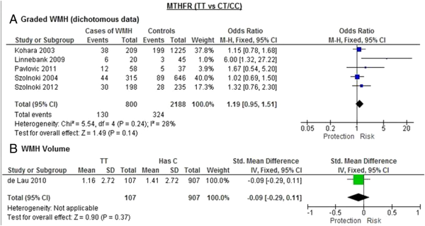 Meta-analysis, forest plot and pooled OR of risk from studies investigating the association between WMH and methylene tetrahydrofolate reductase, MTHFR (TT vs CT/CC, recessive model). (A) Graded WMH, dichotomous data (B) WMH volume. MTHFR, methylene tetrahydrofolate reductase; WMH, white matter hyperintensities.