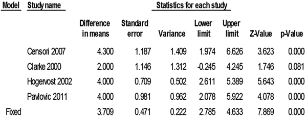 The remaining four studies covering 745 Caucasian participants were meta-analysed and a comparison of WMH cases vs controls found a pooled mean difference in plasma Hcy levels of 3.71 μmol/L (95% CI 2.79 to 4.63; p<0.00001; I2=0%) (figure 3). CMA V.2.0 software was used to calculate the corresponding pooled OR of risk of WMH for this mean difference in Hcy levels using a fixed effects analysis model, OR=2.93 (95% CI 2.18 to 3.94).