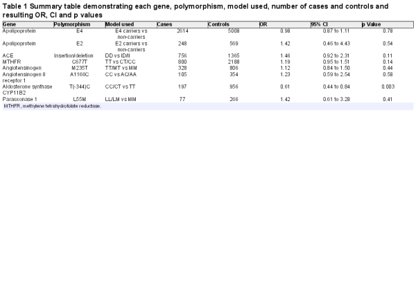 Our initial search identified 1248 studies with 20 additional records from references of relevant articles. Removal of duplicates and matches to our predefined inclusion and exclusion criteria resulted in 43 studies which had available data for meta-analysis interrogating nine polymorphisms in 10 different genes (figure 1). The majority used MRI to assess WMH in (mostly Caucasian) participants aged between 60 and 80 years. Most of the genes studied were involved in the renin-angiotensin-aldosterone system (ACE, angiotensinogen (AGT), angiotensin II receptor 1, aldosterone synthase). The other identified genes had roles in Hcy levels (MTHFR), antiatherosclerosis (paraoxonase 1) and cholesterol regulation (apolipoprotein E). Other gene polymorphisms studied were brain-derived neurotrophic factor/Val66Met and nitric oxide synthase 3/G894T, but some studies had yet to be replicated and others did not have data available for meta-analysis (table 1).