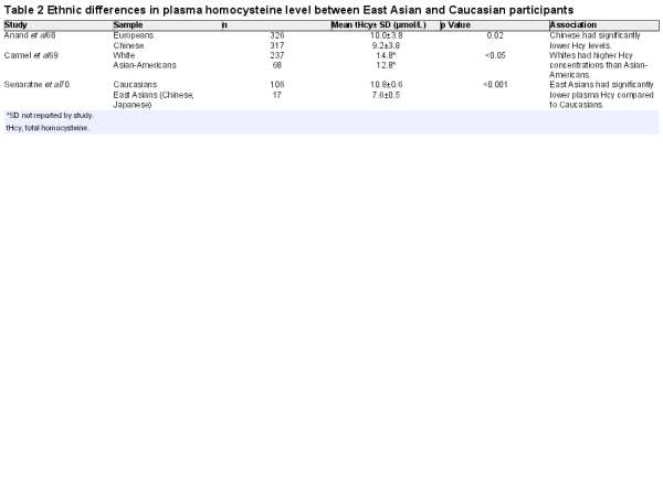 Ethnic differences in plasma Hcy levels are well documented with East Asians consistently reported to have significantly lower Hcy levels compared to Caucasians (table 2). Given these ethnic disparities, we considered it appropriate to exclude studies of East Asian (ie, Japanese, Korean) participants from the Mendelian randomisation, as the majority of studies were conducted in participants of European descent.