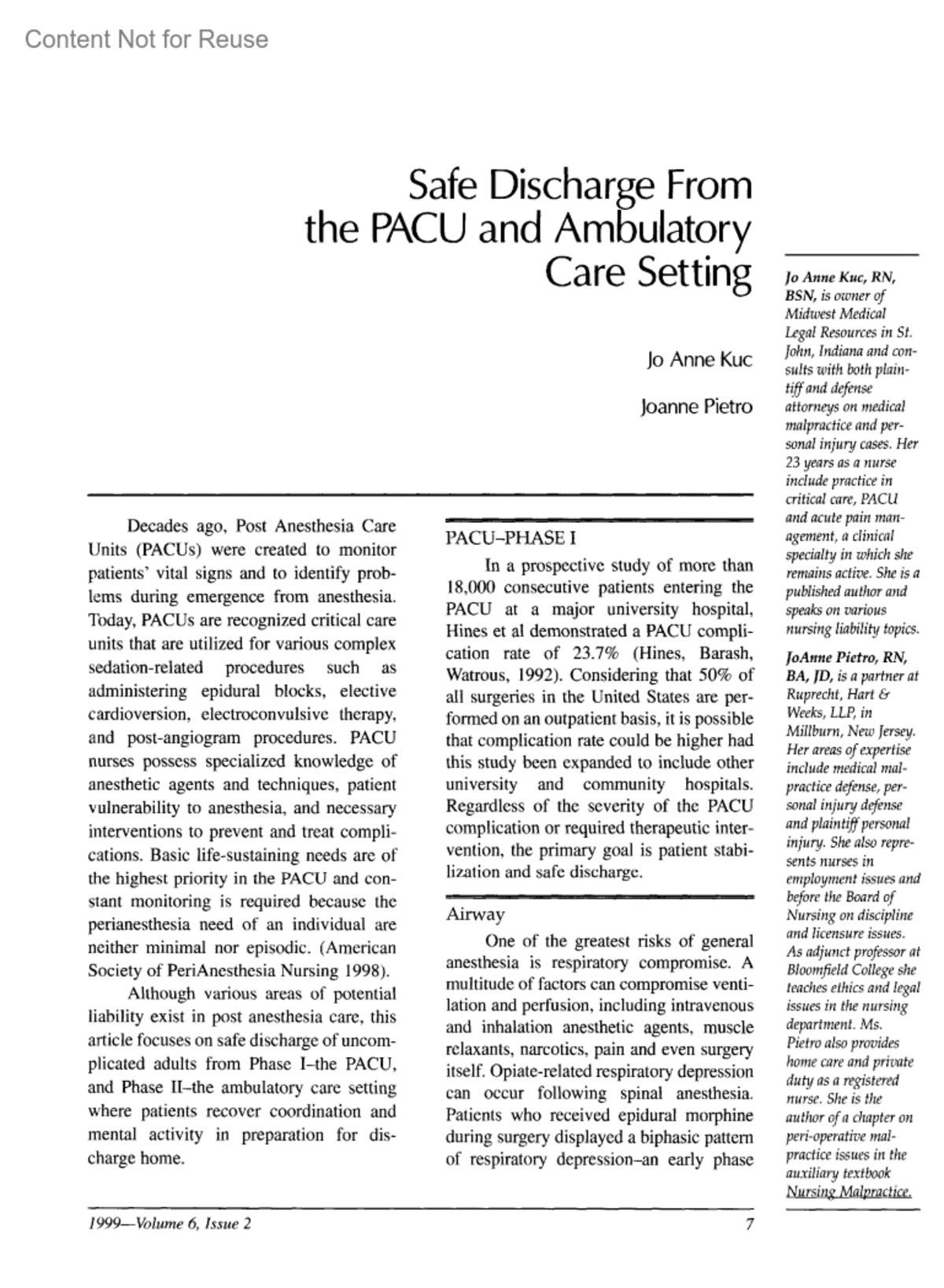 1Jo Anne Kuc, RN, BSN, is owner of Midwest Medical Legal Resources in St. John, Indiana and consults with both plaintiff and defense attorneys on medical malpractice and personal injury cases. Her 23 years as a nurse include practice in critical care, PACU and acute pain management, a clinical specialty in which she remains active. She is a published author and speaks on various nursing liability topics.