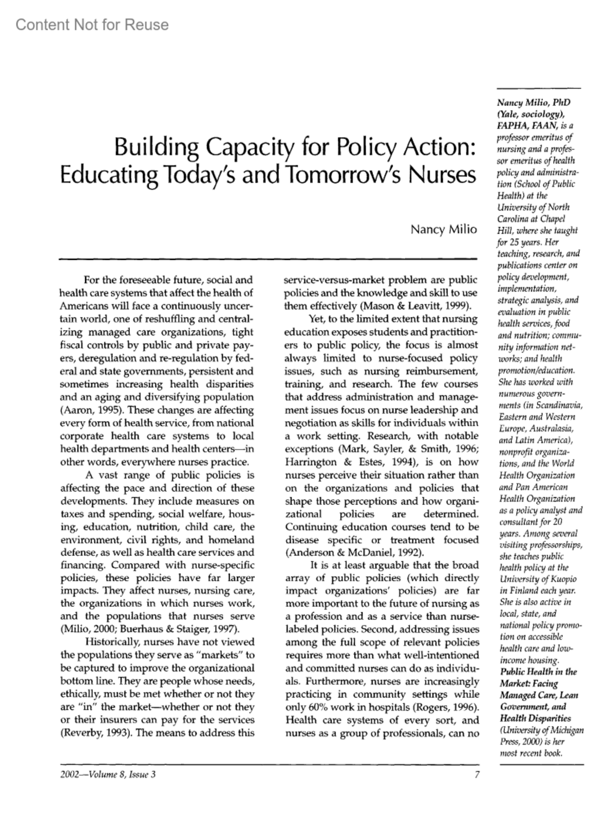 Nancy Milio, PhD (Yale, sociology), FAPHA, FAAN,is a professor emeritus of nursing and a professor emeritus of health policy and administration (School of Public Health) at the University of North Carolina at Chapel Hill, where she taught for 25 years. Her teaching, research, and publications center on policy development, implementation, strategic analysis, and evaluation in public health services, food and nutrition; community information networks; and health promotion/education. She has worked with numerous governments (in Scandinavia, Eastern and Western Europe, Australasia, and Latin America), nonprofit organizations, and the World Health Organization and Pan American Health Organization as a policy analyst and consultant for 20 years. Among several visiting professorships, she teaches public health policy at the University of Kuopio in Finland each year. She is also active in local, state, and national policy promotion on accessible health care and lowincome housing.Public Health in the Market: Facing Managed Care, Lean Government, and Health Disparities(University of Michigan Press, 2000) is her most recent book.