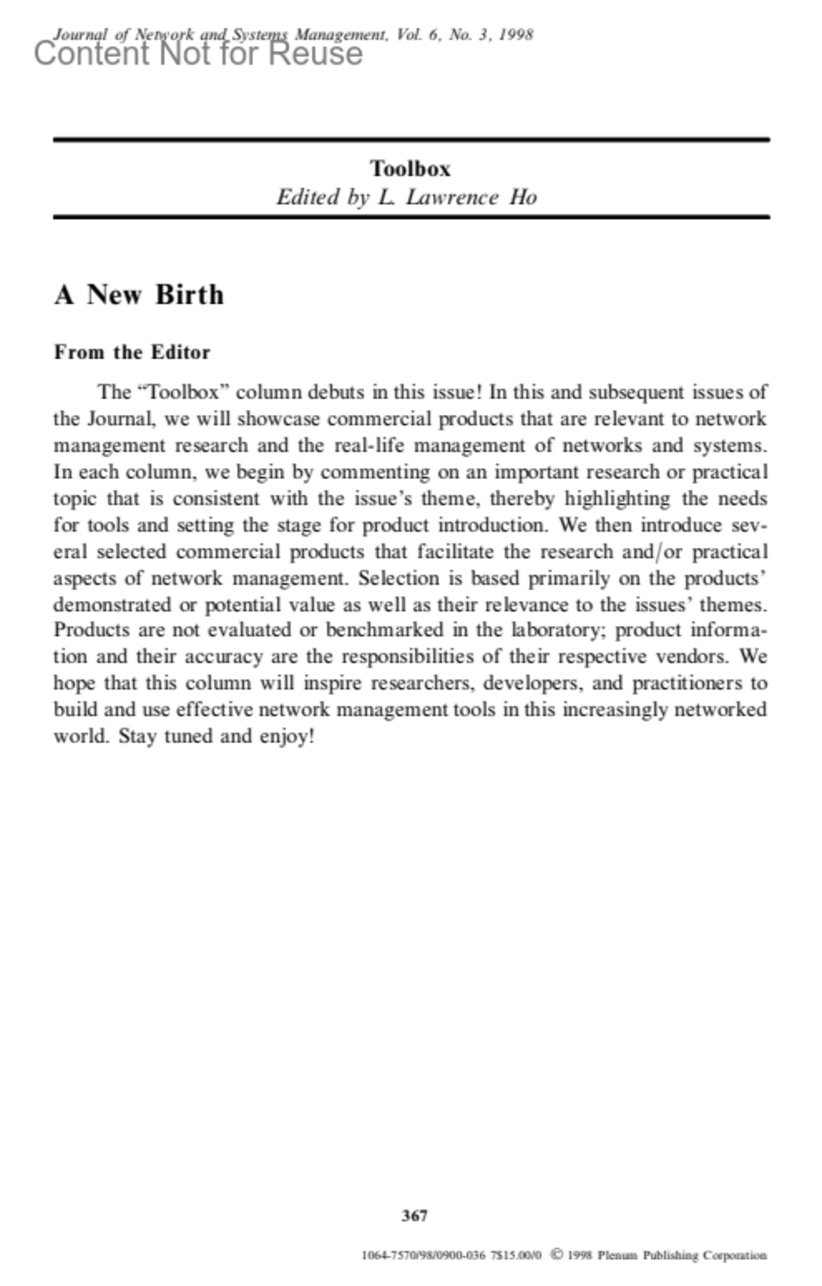 A New BirthHo, L. LawrenceAuthor informationBell Laboratories, Lucent Technologies, Holmdel, New Jersey 07733.E-mail: [email protected]Journal of Network & Systems Management 6(3):p 367-369, 1998.Copyright ©1998 Kluwer Academic Publishers