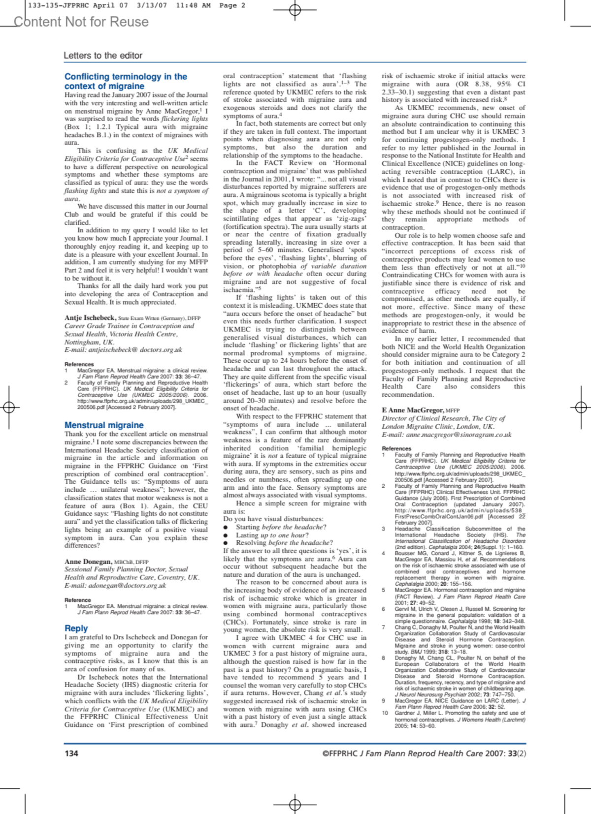 Menstrual migraineMacGregor, Anne E MFFPAuthor informationDirector of Clinical Research, The City of London Migraine Clinic, London, UK. E-mail:[email protected]Journal of Family Planning & Reproductive Health Care 33(2):p 134, April 2007.Copyright © 2007 BMJ Publishing Group Ltd