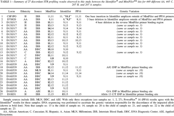 The AmpFℓSTR® MiniFiler™ polymerase chain reaction amplification kit developed by Applied Biosystems enables size reduction on eight of the larger STR loci amplified in the Identifiler® kit, which will aid recovery of information from highly degraded DNA samples. The MiniFiler™ Kit amplifies CSF1PO, FGA, D2S1338, D7S820, D13S317, D16S539, D18S51, and D21S11 as well as the sex-typing locus amelogenin. A total of 1308 samples were evaluated with both the MiniFiler™ and Identifiler® STR kits: 449 African American, 445 Caucasian, 207 Hispanic, and 207 Asian individuals. Full concordance between Identifiler and MiniFiler Kits was observed in 99.7% (10,437 out of 10,464) STR allele calls compared. The 27 differences seen are listed in Table 1 and encompass the loci D13S317 (n = 14) and D16S539 (n = 10) as well as D18S51 (n = 1), D7S820 (n = 1), and CSF1PO (n = 1). Genotyping discrepancies between the Identifiler and MiniFiler kits were confirmed by reamplification of the samples and further testing using the PowerPlex® 16 kit in many cases. DNA sequence analysis was also performed in order to understand the nature of the genetic variations causing the allele dropout or apparent repeat unit shift.