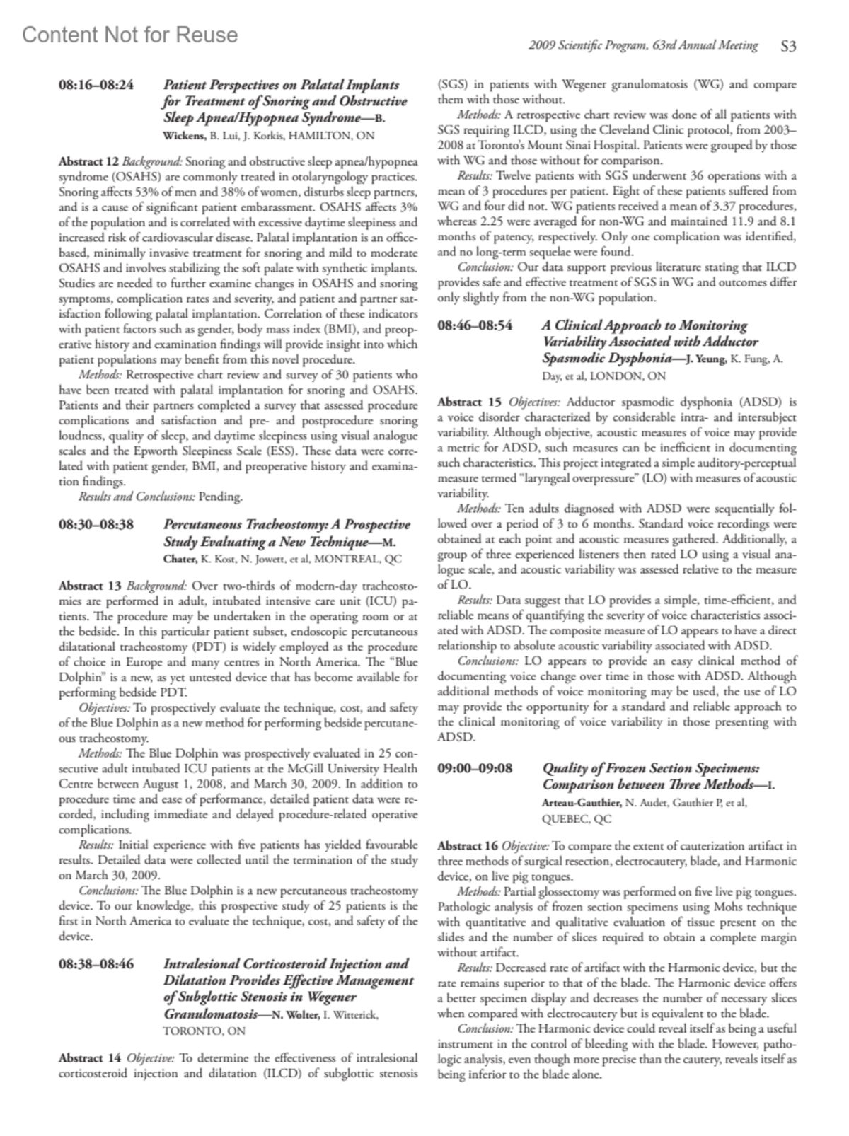 Journal of Otolaryngology: Head and Neck Surgery 38:p S3, May 2009.
