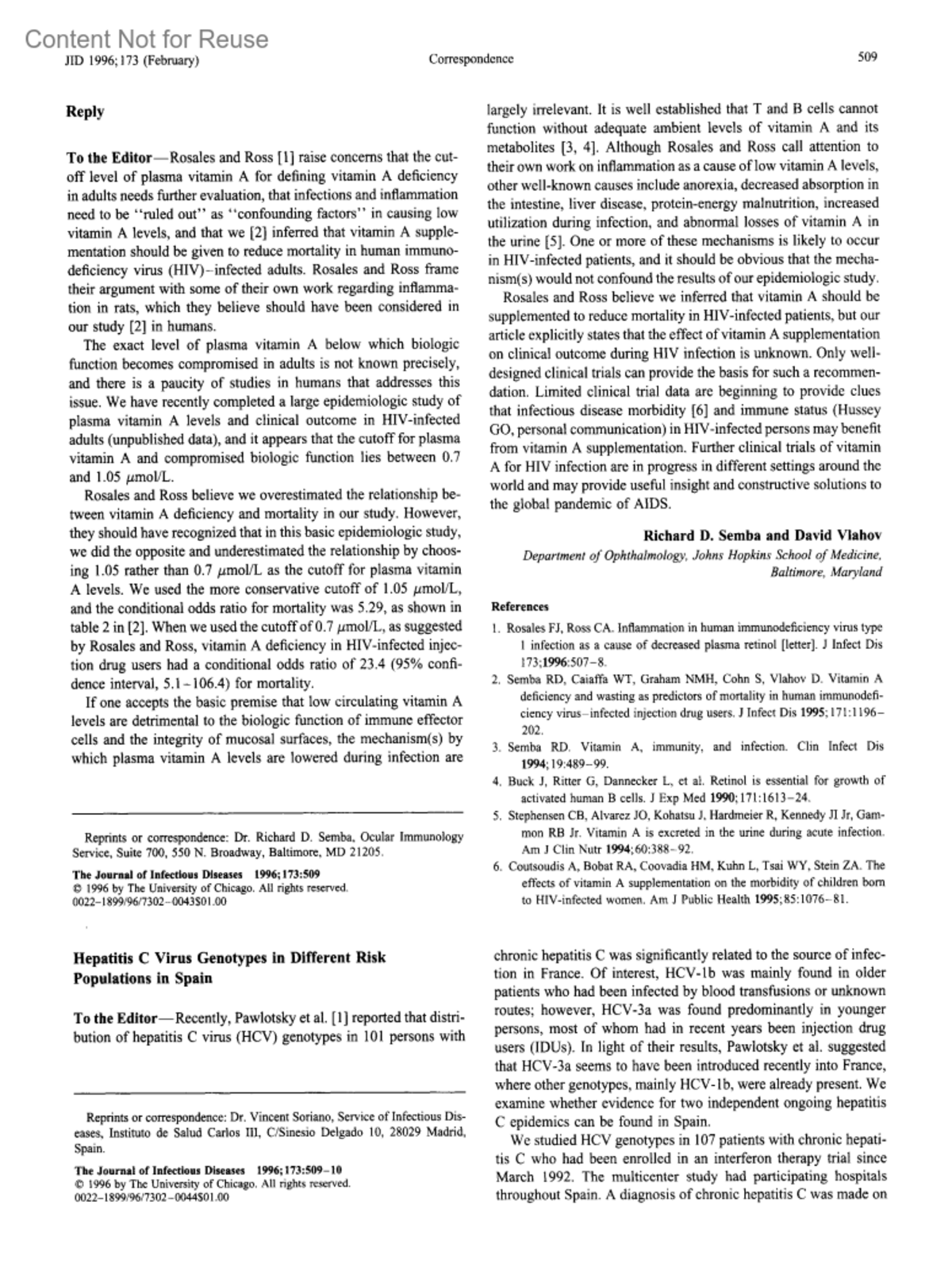 Inflammation in Human Immunodeficiency Virus Type 1 Infection as a Cause of Decreased Plasma RetinolSemba, Richard D.Vlahov, DavidAuthor informationDepartment of Ophthalmology, Johns Hopkins School of Medicine, Baltimore, MarylandReprints or correspondence: Dr. Richard D. Semba, Ocular Immunology Service, Suite 700, 550 N. Broadway, Baltimore, MD 21205.All rights reserved.0022-1899/96/7302-0043$01.00Journal of Infectious Diseases 173(2):p 509, February 1996.Copyright © Copyright Oxford University Press 1996.