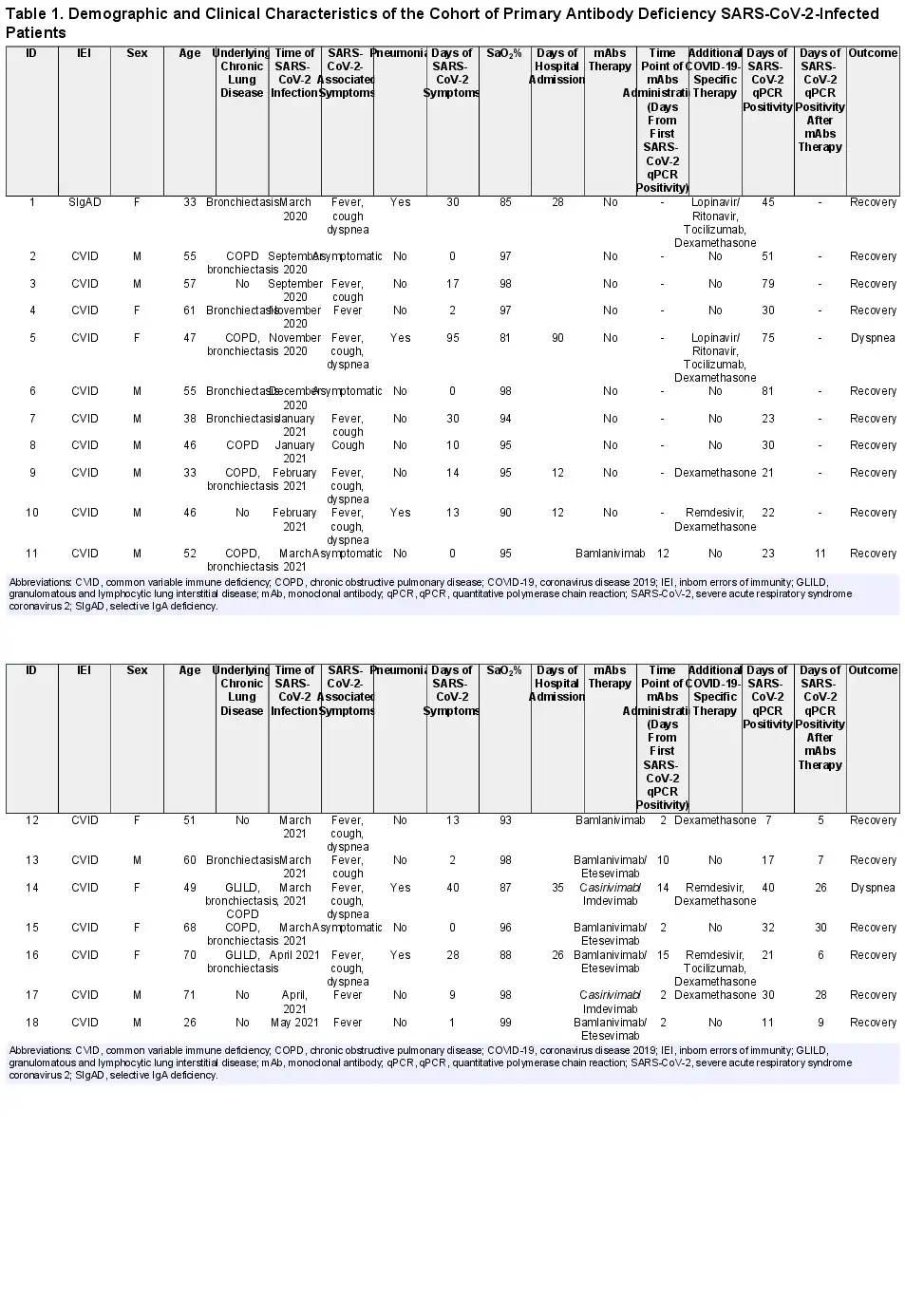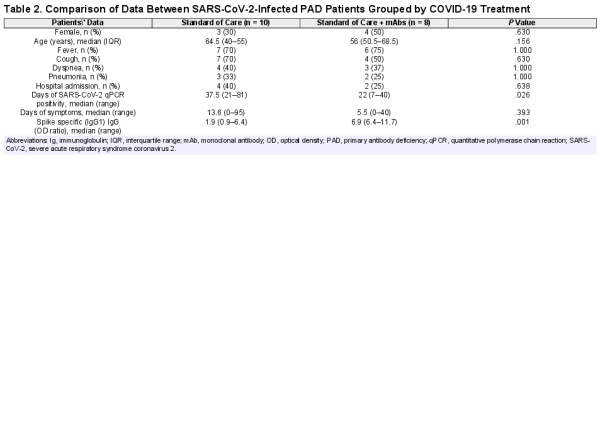 Adult (≥18 years old) PAD patients with SARS-CoV-2 infection and routinely observed by Care Centers of Rome and Treviso were enrolled in this prospective study. Diagnosis of PAD was done according to the ESID criteria (www.ESID.com). Symptomatic patients were considered to be positive for SARS-CoV-2 by quantitative polymerase chain reaction (qPCR) on nasopharyngeal swabs obtained within 1 day after onset of symptoms. Asymptomatic patients were identified by screening patients attending the hospital or in case of family contact. The duration of viral positivity was calculated as the interval between the first positive and the first negative nasopharyngeal swab for SARS-CoV-2. Participants were grouped on the basis of the treatment with mAbs in 2 groups: standard of care treatment (Group 1) and standard of care treatment plus mAbs (Group 2). During the study time, patients were allowed to continue their therapies, including immunoglobulin (Ig) replacement for the underlying antibody deficiency, and were monitored for their clinical status. During SARS-CoV-2 infection, patients were tested using quantitative reverse-transcription PCR (qRT-PCR) every 7–10 days until a negative result was confirmed.