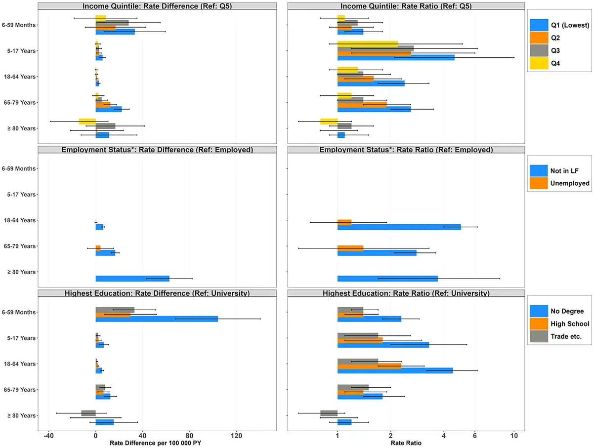 Age-stratified rate differences per 100 000 person-years and rate ratios (95% confidence interval [CI]) of respiratory syncytial virus hospitalizations according to income quintile of economic family, employment status, and highest level of education attained, Canada, 2016–2019. *Results not displayed for missing/not applicable categories (based on zero hospitalizations occurring in at least 1 comparator category). Rates are based on unrounded frequencies. Age groups based on age at time of hospitalization for numerator, and person-years contributed to age group for denominator. All rate estimates with 95% CIs estimated using Poisson regression with offset term for the log of person-time. Abbreviations: LF, labor force; PY, person-years; Q1–Q5, quintiles; Ref, reference; Trade etc., postsecondary nonuniversity/trade school.