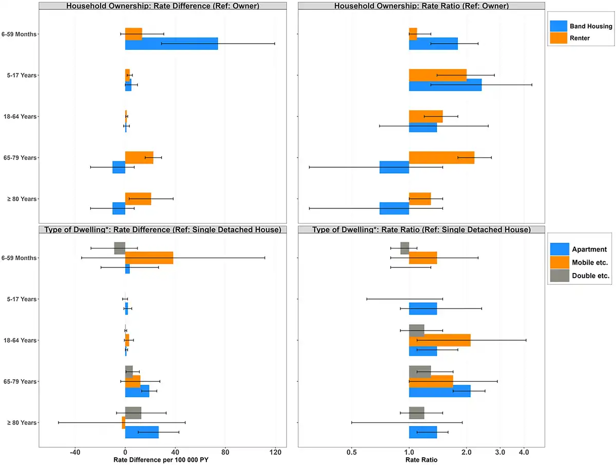 With respect to housing characteristics, the largest overall inequities were observed on the basis of household ownership and dwelling type. Compared to homeowners, individuals who resided on reserves/settlements or rented their home experienced a 1.6- and 1.3-fold increase in RSV-related hospitalizations, respectively (RR, 1.6 [95% CI, 1.3–1.9]; RR, 1.3 [95% CI, 1.2–1.5]); the magnitude of these differences also varied by age, with some of the largest absolute differences among renters aged ≥65 years and children aged <5 years on reserves (compared to homeowner counterparts). Further, individuals living in an apartment or in a mobile/movable home experienced higher rates compared to those in a single detached home (RR, 1.6 [95% CI, 1.5–1.8] and 1.6 [95% CI, 1.2–2.1]; RD, 6.8 [95% CI, 5.2–8.4] and 6.1 [95% CI, 1.1–11.1], respectively), a trend observed among adult age groups only (Figure 2; Supplementary Tables 3 and 4).