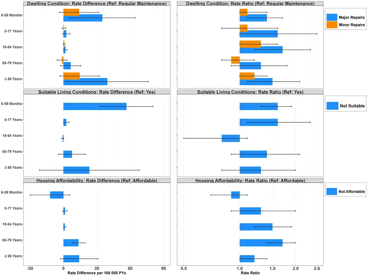 In contrast, unsuitable living conditions demonstrated a significant increase in hospitalization rates among child age groups only (6–59 months: RR, 1.6 [95% CI, 1.3–1.9]; 5–17 years: RR, 1.6 [95% CI, 1.1–2.4]), with an absolute difference of 56.6 cases per 100 000 person-years for children aged <5 years living in unsuitable versus suitable homes. While individuals living in unaffordable homes experienced higher rates compared to those in affordable homes overall, these inequities were most apparent among adults 18–79 years old (18- to 64-year-olds: RR, 1.5 [95% CI, 1.2–1.9]; 65- to 79-year-olds: RR, 1.7 [95% CI, 1.4–2.0]), with the greatest absolute difference in 65- to 79-year-olds (RD, 13.5 [95% CI, 7.7–19.3]). Last, individuals living in homes requiring major repairs had higher RSV-related hospitalization rates relative to those in homes only requiring regular maintenance (RR, 1.2 [95% CI, 1.1–1.4]); the largest absolute differences were observed among those aged <5 years (RD, 34.9 [95% CI, 5.4–64.4]) and ≥80 years (RD, 39.4 [95% CI, 2.4–76.3]) (Figure 3; Supplementary Tables 3 and 4).