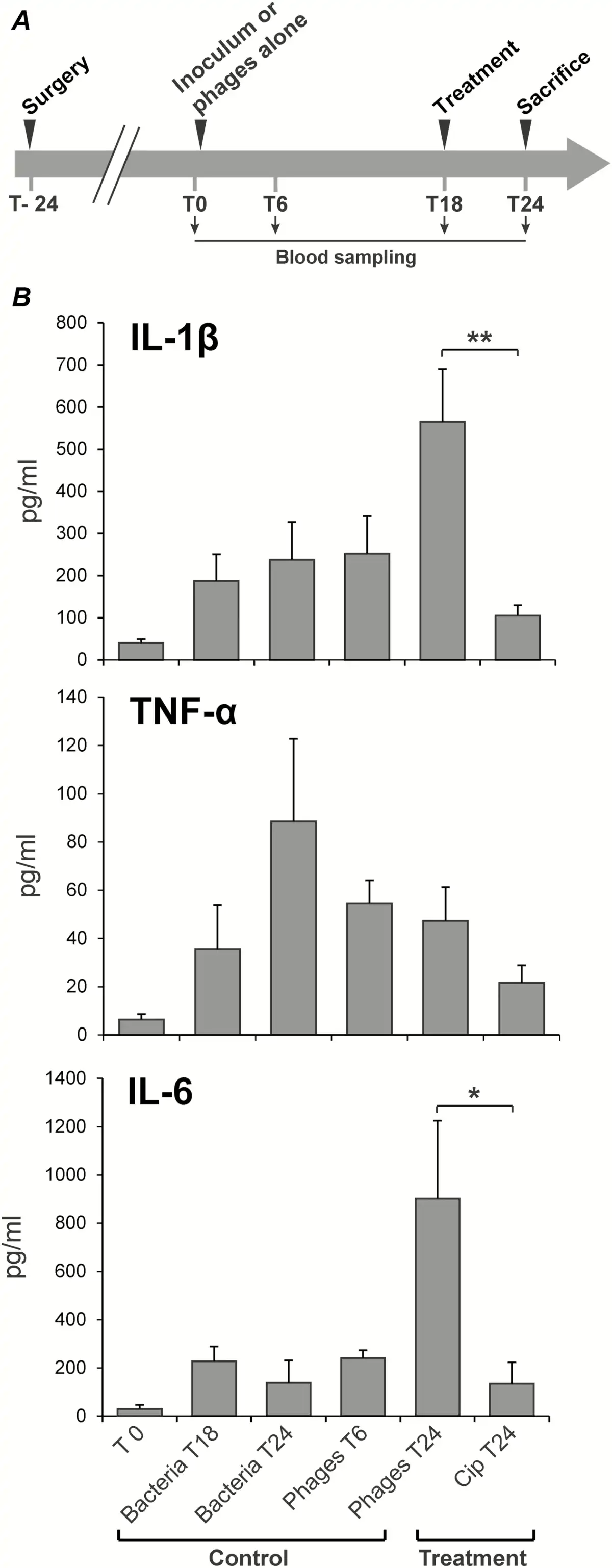 Cytokine quantification in rat plasma during experimental endocarditis. A, Protocol of blood sampling for cytokine quantification. B, Levels of interleukin 1β (IL-1β), interleukin 6 (IL-6), and tumor necrosis factor α (TNF-α) measured after 6 hours of phage or antibiotherapy (treatment). Controls included rats 24 hours after surgery (inoculum, T0), untreated but infected rats for 18 hours or 24 hours (bacteria T18 and T24), and uninfected rats receiving phage for 6 hours (Phages T6). Each value represents the mean ± SEM from 4–10 individual animals (*, P = .03; **, P = .005 using the Mann–Whitney test). Abbreviation: cip, ciprofloxacin.
