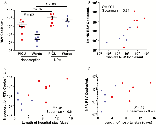 Nasosorption (NS) and nasopharyngeal aspiration (NPA) for respiratory syncytial virus (RSV) load quantitation. A, RSV load measured by NS and NPA from infants admitted to the pediatric intensive care unit (PICU) on mechanical ventilation (n = 7) and nonventilated infants on general paediatric wards (n = 5). B, Reproducibility of NS RSV load measurements (n = 12; same subjects and data as A, see Methods). Correlation between length of admission and RSV load as measured by NS (C) and NPA (D). RSV-A, circle; RSV-B, square; RSV+ Wards/nonventilated, blue; RSV+ PICU/ventilated, red. Data were analyzed by 2-tailed Mann–Whitney U tests, 2-tailed Wilcoxon matched pairs tests, or Spearman correlations as applicable. Abbreviations: NPA, nasopharyngeal aspiration; NS, nasosorption; PICU, pediatric intensive care unit; RSV, respiratory syncytial virus.