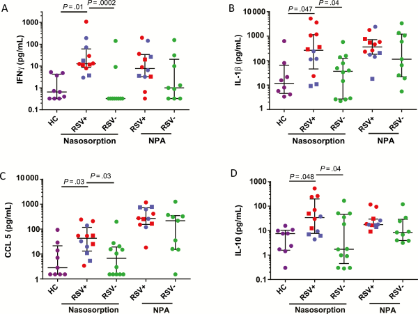 Nasosorption (NS) associates respiratory syncytial virus (RSV) infection with elevated mucosal cytokines. Levels of interferon γ (A), interleukin 1β (B), CCL5/RANTES (C), and interleukin 10 (D) as measured by NS from healthy control subjects (HC, n = 9) as well as NS and nasopharyngeal aspiration (NPA) from bronchiolitic patients associated with RSV (RSV+, n = 12) and other respiratory infections (RSV−, n = 12). RSV-A, circle; RSV-B, square; RSV+ Wards/nonventilated, blue; RSV+ PICU/ventilated, red. Nasosorption cytokine data were analyzed using Kruskall–Wallis test with Dunns correction for multiple comparisons, 2-tailed Mann–Whitney U tests were used for NPA cytokine data. Abbreviations: HC, healthy control; IFN-γ, interferon γ; IL-1β, interleukin 1β; IL-10, interleukin 10; NPA, nasopharyngeal aspiration; RSV, respiratory syncytial virus.