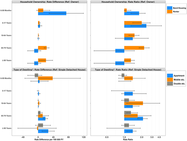 Age-stratified rate differences per 100 000 person-years and rate ratios (95% confidence interval [CI]) of respiratory syncytial virus hospitalizations according to household ownership status and type of dwelling, Canada, 2016–2019. *Results not displayed for missing/not applicable categories (based on zero hospitalizations occurring in at least 1 comparator category). In accordance with Statistics Canada's rules, rates based on frequencies <5 were not disclosed, and estimates were collapsed where appropriate. Rates are based on unrounded frequencies. Age groups based on age at time of hospitalization for numerator, and person-years contributed to age group for denominator. All rate estimates with 95% CIs estimated using Poisson regression with offset term for the log of person-time. Abbreviations: Double etc., double, row or terrace, duplex; Mobile etc., mobile/movable home; PY, person-years; Ref, reference.