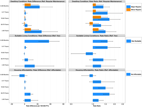 In contrast, unsuitable living conditions demonstrated a significant increase in hospitalization rates among child age groups only (6–59 months: RR, 1.6 [95% CI, 1.3–1.9]; 5–17 years: RR, 1.6 [95% CI, 1.1–2.4]), with an absolute difference of 56.6 cases per 100 000 person-years for children aged <5 years living in unsuitable versus suitable homes. While individuals living in unaffordable homes experienced higher rates compared to those in affordable homes overall, these inequities were most apparent among adults 18–79 years old (18- to 64-year-olds: RR, 1.5 [95% CI, 1.2–1.9]; 65- to 79-year-olds: RR, 1.7 [95% CI, 1.4–2.0]), with the greatest absolute difference in 65- to 79-year-olds (RD, 13.5 [95% CI, 7.7–19.3]). Last, individuals living in homes requiring major repairs had higher RSV-related hospitalization rates relative to those in homes only requiring regular maintenance (RR, 1.2 [95% CI, 1.1–1.4]); the largest absolute differences were observed among those aged <5 years (RD, 34.9 [95% CI, 5.4–64.4]) and ≥80 years (RD, 39.4 [95% CI, 2.4–76.3]) (Figure 3; Supplementary Tables 3 and 4).