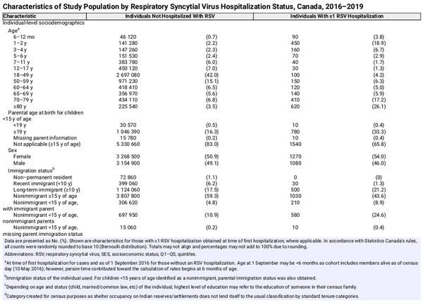 These gaps in existing research examining social inequities in RSV burden must be addressed to help inform future guidelines, program evaluations, and equitable allocation strategies for emerging RSV immunizations. Our study aimed to overcome these limitations by using data from a large population-based cohort study in Canada. This data linkage includes information on individual-level SES indicators not commonly available in health administrative data. Specifically, the goal of this work was to describe the preimmunization-era burden of RSV-related hospitalizations among noninstitutionalized Canadians (excluding Québec) ≥6 months of age, by largely unexplored individual-level SES indicators and age.