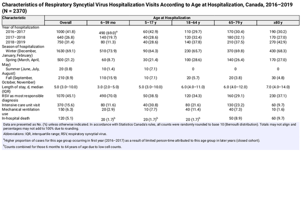 Our primary outcome was RSV-related hospitalization as identified in the DAD. An individual was considered to have an RSV-related hospitalization based on a validated algorithm (presence of 1 of 4 RSV-related ICD-10-CA codes) shown to have moderate to high sensitivity and high specificity in both children and adults []. Postadmission diagnoses of RSV were excluded to attempt to limit cases to community-acquired infections. Hospitalization entries within 1 day of a previous discharge date for the same individual were assumed to reflect a single hospital care episode (eg, transfers between healthcare facilities) and were thus merged []. Given the potential for reinfection over time, we allowed for an individual to have 1 hospitalization per season. Among those with an RSV-related hospitalization, secondary outcomes including intensive care unit (ICU) admission, mechanical ventilation use, and in-hospital death were also captured.