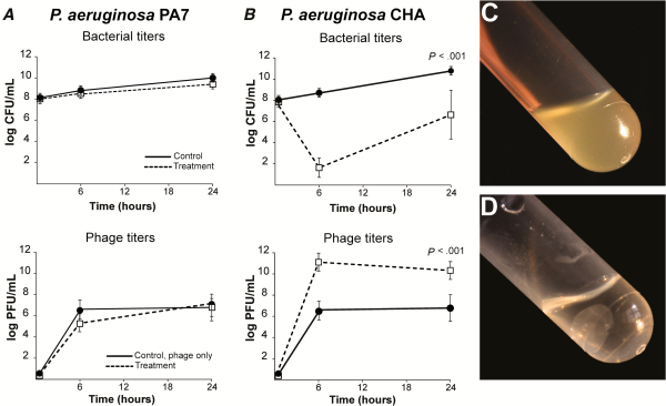 Activity of phage cocktail PP1131 in in vitro fibrin clots. Clots were produced from rat plasma and infected with 108 colony-forming units (CFUs)/mL of either phage-resistant Pseudomonas aeruginosa strain PA7 (A) or phage-susceptible strain CHA (B). Clots were left untreated (solid lines) or exposed to 108 PFUs/mL of PP1131 for 24 hours at 37°C (dashed lines). Phage titers in noninfected clots (solid lines) and in PA7-infected or CHA-infected clots (dashed lines) were determined 6 hours and 24 hours after exposure to the phage cocktail. Clots infected with strain PA7 lysed in spite of phage treatment (C), whereas those infected with phage-susceptible CHA and treated with phages remained intact (D). P values were determined using the Mann–Whitney test.
