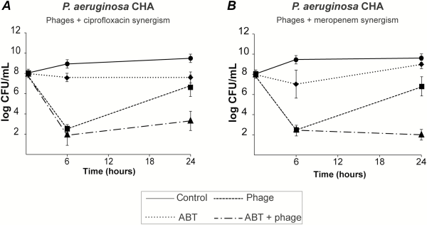 Bactericidal synergism between phages and selected antibiotics. Bacterial killing by phage-antibiotic combinations was tested by using 108 PFUs/mL of PP1131 with 2.5-times the minimum inhibitory concentration (MIC) of ciprofloxacin (A) or meropenem (B) (MIC of 0.19 µg/mL and 0.125 µg/mL, respectively). Each value represents the mean ± SD of 4–16 independent clots. Abbreviation: ABT, antibiotic.