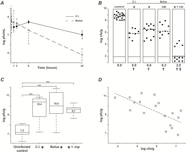 Altogether our results provide a strong proof of concept for phage therapy of deep-seated and systemic infections. Moreover they raise the provocative possibility that certain infections might be cured by a single phage injection most efficiently combined with synergistic antibiotics. Indeed, once locally established, phages can multiply in situ and do not necessitate further administration.