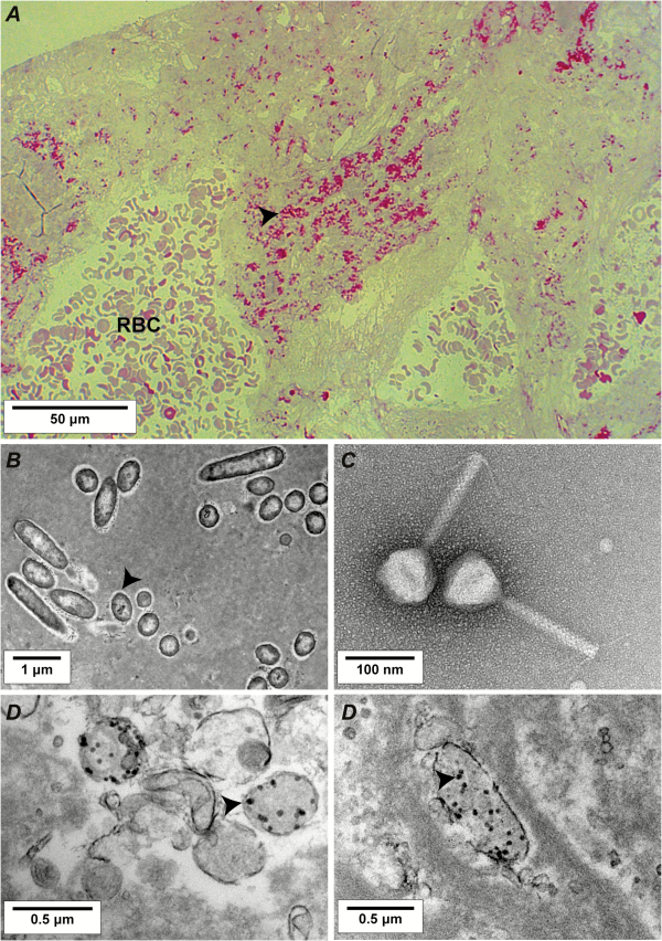 Light microscopy and transmission electron microscopy of rat vegetations after 6 hours of phage therapy. A, Semithin section (200 nm) of control vegetation infected with Pseudomonas aeruginosa CHA stained using the modified Braun Brenn staining protocol []. Arrows indicate bacteria, stained in red. B, Transmission electron microscopy of ultrathin sections (50 nm) of control vegetation infected with P. aeruginosa CHA positive-stained using uranium acetate and lead citrate. Arrows indicate bacteria. C, Example of a negative staining of a myoviridae phage present in the cocktail; other phages morphotypes including podoviridae were also present. D, Transmission electron microscopy of vegetation infected by P. aeruginosa CHA and treated with the phage cocktail. Arrows indicate phage capsids inside lysed bacteria. Abbreviation: RBC, red blood cell.