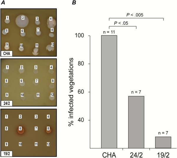 To determine whether these mutants had altered virulence, they were tested for their capability to infect sterile vegetations. A single bolus of 108 CFUs (ie, infective dose 90% of parent strain) led to the infection of <60% (P < .05) and <30% (P < .01) of vegetations for mutants 19/2 and 24/2, respectively (Figure 6B). Moreover, the median bacterial densities in the infected vegetations were significantly lower than in rats infected with the parent strain (CHA: 8.9 CFUs/g; 24/2: 7.3 CFUs/g; and 19/2: 6.8 CFUs/g; P < .05), and blood cultures were negative.