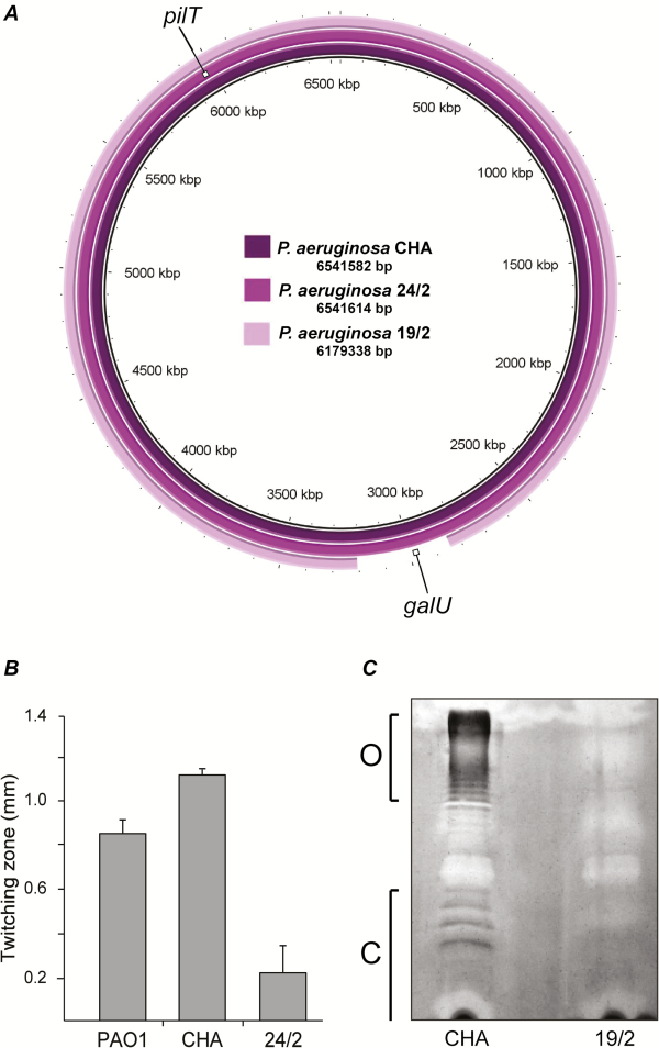 Characterization of phage-resistant Pseudomonas aeruginosa mutants. The 2 phage-resistant P. aeruginosa mutants, 24/2 and 19/2, isolated in vitro were further characterized regarding to genomic content and phenotypes. A, Variant 24/2 displayed a 15-basepair deletion in the pilT gene, and variant 19/2 displayed a 362-kb chromosomal deletion that encompassed the galU gene. B, Impaired twitching motility resulting from the pilT alteration in variant 24/2, as compared with wild-type PAO1 and parent CHA. C, Impaired LPS synthesis resulting from the galU deletion in variant 19/2 with absence of O-antigen (O) and LPS core (C), as compared with parent CHA.