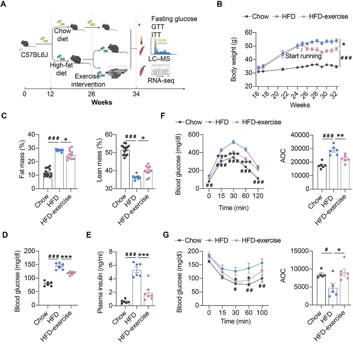 Exercise intervention mitigates HFD-induced systemic glucose homeostasis dysregulation. (A) Schematic representation of the experimental procedures. (B) Dynamic body weight changes in mice with indicated treatments (n = 6 mice per group). ###P < 0.001, HFD vs. Chow; *P < 0.05, HFD-exercise vs. HFD; two-way ANOVA. (C) Body composition of mice in the indicated groups (n = 15 mice for the Chow group, n = 8 mice for for the HFD group, n = 11 mice for the HFD-exercise group). ###P < 0.001, HFD vs. Chow; *P < 0.05, HFD-exercise vs. HFD; one-way ANOVA followed by Tukey's multiple comparisons test. (D) Overnight fasting blood glucose levels at 6 weeks post exercise intervention (n = 6 mice per group). ###P < 0.001, HFD vs. Chow; ***P < 0.001, HFD-exercise vs. HFD; one-way ANOVA followed by Tukey's multiple comparisons test. (E) Overnight fasting blood insulin levels at 8 weeks post exercise intervention (n = 6 mice for the Chow group, n = 6 mice for the HFD group, n = 7 mice for the HFD-exercise group). ###P < 0.001, HFD vs. Chow; ***P < 0.001, HFD-exercise vs. HFD; one-way ANOVA followed by Tukey's multiple comparisons test. (F) GTT at 8 weeks post exercise intervention (n = 6 mice per group) (left). ##P < 0.01, ###P < 0.001, HFD vs. Chow; ***P < 0.001, HFD-exercise vs. HFD; two-way ANOVA followed by Tukey's multiple comparisons test. AOC quantification of GTT results (right). ###P < 0.001, HFD vs. Chow; **P < 0.01, HFD-exercise vs. HFD; one-way ANOVA followed by Tukey's multiple comparisons test. (G) ITT at 7 weeks post exercise intervention (n = 5 mice for the Chow group, n = 5 mice for for the HFD group, n = 6 mice for the HFD-exercise group) (left). #P < 0.05, ##P < 0.01, HFD vs. Chow; *P < 0.05, HFD-exercise vs. HFD; two-way ANOVA followed by Tukey's multiple comparisons test. AOC quantification of ITT results (right). #P < 0.05, HFD vs. Chow; *P < 0.05, HFD-exercise vs. HFD; one-way ANOVA followed by Tukey's multiple comparisons test.