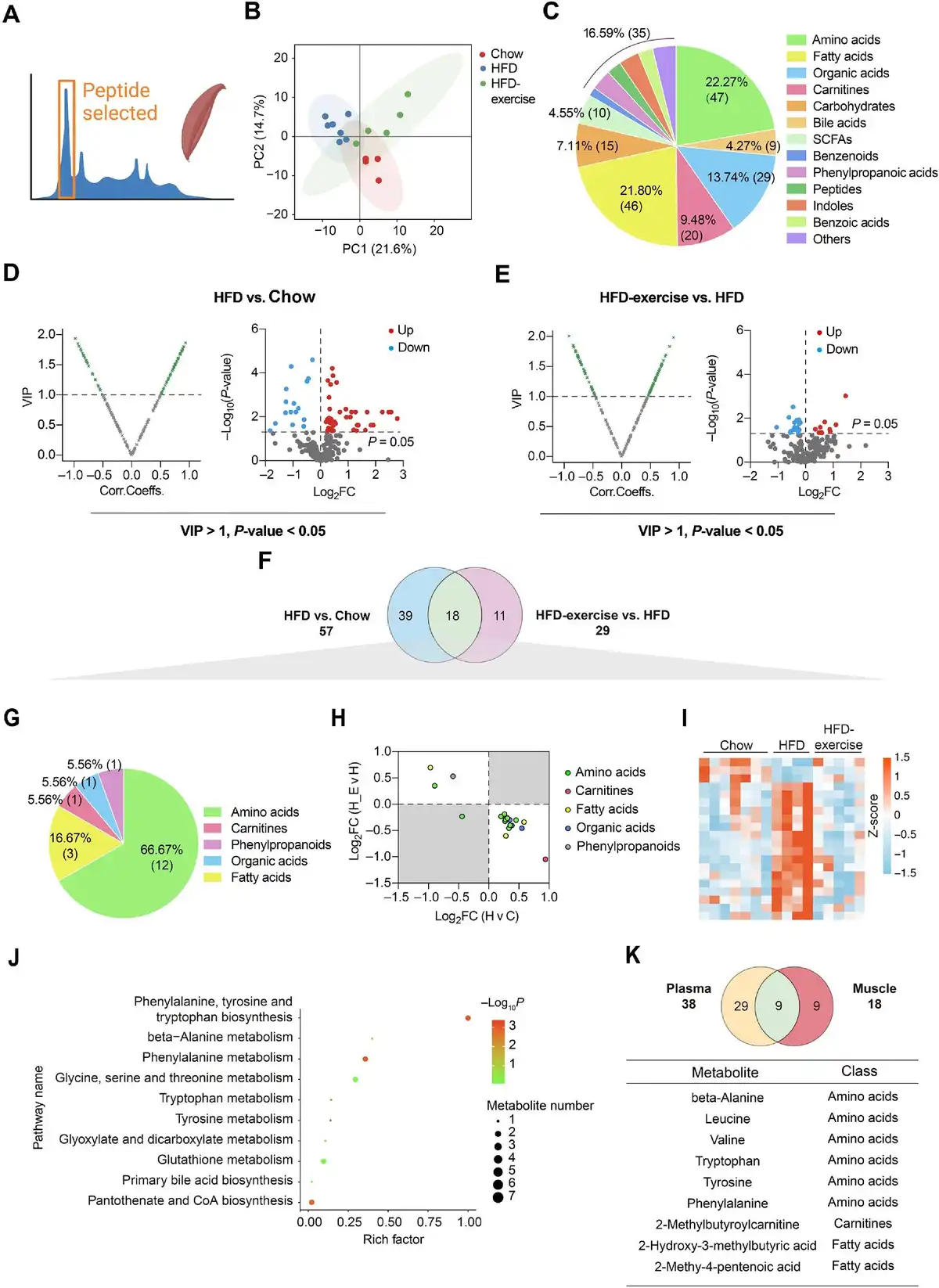 Treadmill running reverses HFD-induced changes in plasma metabolites. (A) Metabolomic data of plasma samples from the treadmill running experiment. (B) Scatter plot of PCA for metabolites of mice in the indicated groups. (C) Metabolite composition of plasma samples from indicated groups. SCFA, short-chain fatty acids. (D) Volcano plot of OPLS-DA model for each metabolite in HFD vs. Chow of plasma samples. The metabolites with log10(P-value) > 4 or |log2FC| ≥ 5 were labelled. (E) Volcano plot of OPLS-DA model for each metabolite in HFD-exercise vs. HFD of plasma samples. The metabolites with log10(P-value) > 3 or |log2FC| ≥ 2 were labelled. (F) Venn plot showing the overlap of differential metabolites shown in D and E. (G) Composition of overlapped metabolites (green shaded in F) in the Venn plot. (H) Scatter plot demonstrating that the changes of overlapped metabolites in the plasma were induced by HFD and mitigated by exercise. H v C, HFD vs. Chow; H-E v H, HFD-exercise vs. HFD. (I) Relative content heatmap for overlapped metabolites of mice in the indicated groups (n = 7 mice for the Chow group, n = 5 mice for the HFD group, n = 6 mice for the HFD-exercise group). Scale bar shows Z-score. (J) Bubble plot of significantly altered pathways (P < 0.05) reversed by exercise intervention. The horizontal coordinate is the extent to which the pathway is affected. The number of differential metabolites in the pathway is represented by graphs of different sizes. The P-values calculated by the enrichment analysis are described in terms of their color intensity.