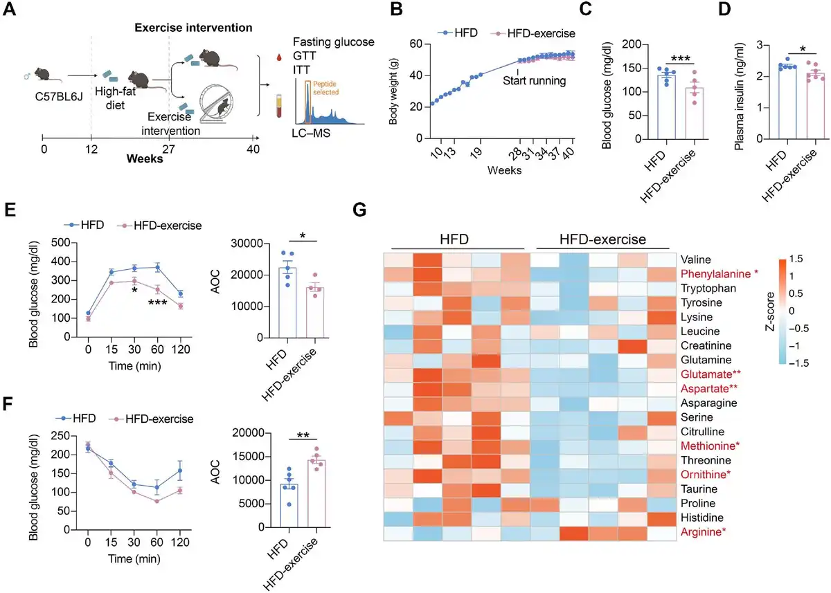 Wheel running can also alter glucose metabolism and metabolite levels. (A) Schematic representation of the experimental procedures. (B) Dynamic body weight changes in mice with indicated treatments (n = 11 mice for the HFD group, n = 9 mice for the HFD-exercise group). (C) Overnight fasting blood glucose levels at 7 weeks post exercise intervention (n = 6 mice for the HFD group, n = 5 mice for the HFD-exercise group). ***P < 0.001, two-tailed unpaired Student's t-test. (D) Overnight fasting plasma insulin levels at 7 weeks post exercise intervention (n = 6 mice for the HFD group, n = 7 mice for the HFD-exercise group). *P < 0.05, two-tailed unpaired Student's t-test. (E) GTT at 8 weeks post exercise intervention (n = 5 mice for the HFD group, n = 4 mice for the HFD-exercise group) (left). *P < 0.05, ***P < 0.001, two-way ANOVA followed by Sidak's multiple comparisons test. AOC quantification of GTT results (right). *P < 0.05, two-tailed unpaired Student's t-test. (F) ITT at 9 weeks post exercise intervention (n = 6 mice for the HFD group, n = 5 mice for the HFD-exercise group) (left). Two-way ANOVA followed by Sidak's multiple comparisons test. AOC quantification of ITT results (right). **P < 0.01, two-tailed unpaired Student's t-test. (G) Heatmap of relative abundance of amino acid metabolites in HFD and HFD-exercise mice (n = 5 mice per group). Scale bar shows Z-score. *P < 0.05, **P < 0.01, two-tailed unpaired Student's t-test.