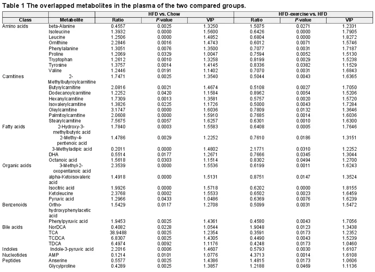 Exercise training is linked to the altered plasma metabolism in HFD mice