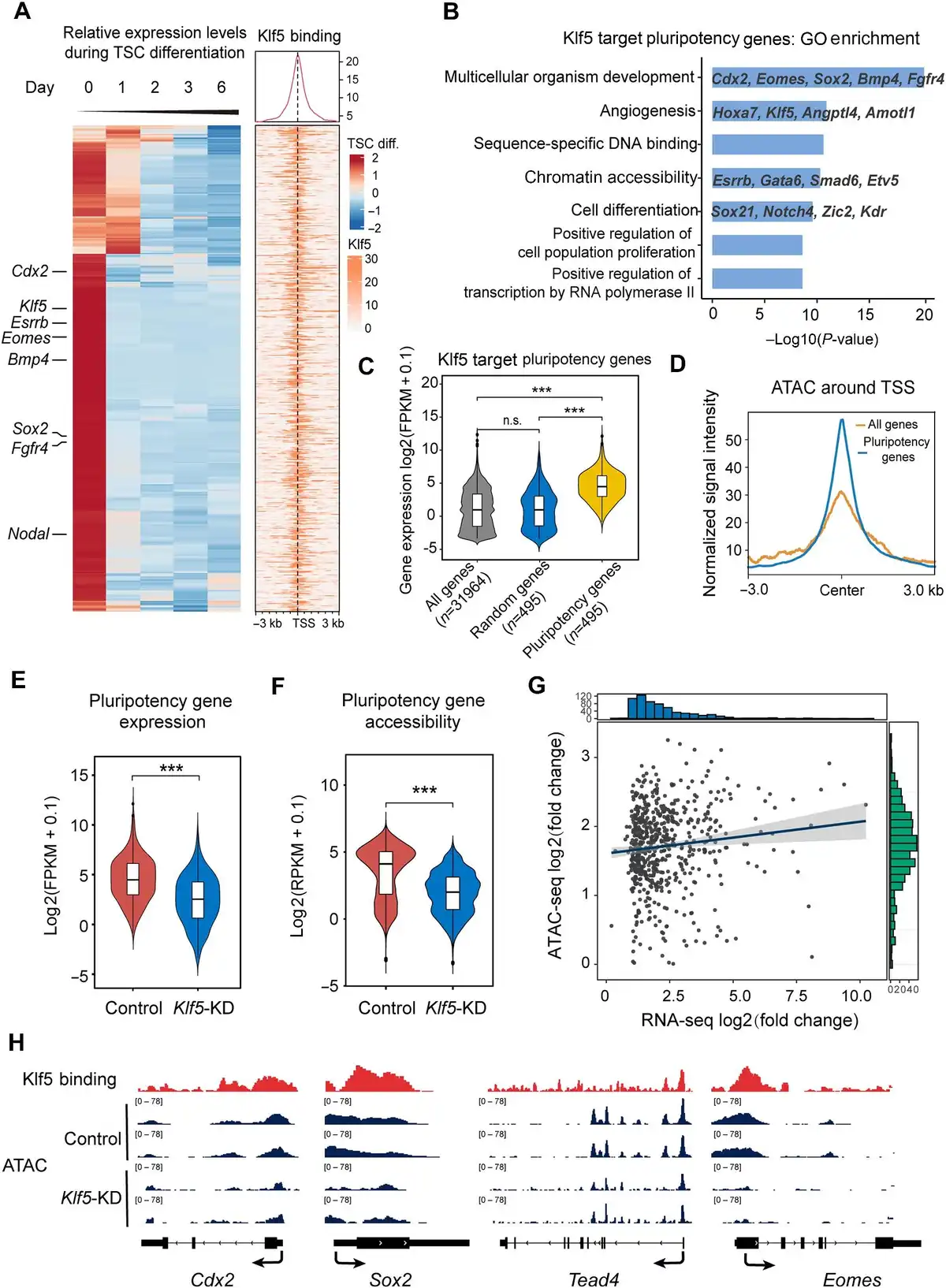 In the present study, we showed critical characteristics of Klf5 in TSC self-renewal and differentiation and unraveled a novel underlying mechanism. At the molecular level, Klf5 participates in TSC core regulation by occupying proximal promoter regions and maintaining an open chromatin structure of its target TSC pluripotency genes. In addition, histone modification of H3K27ac mediated by Klf5 was required for the maintenance of TSCs and proper mouse peri-implantation development. Together, our findings provide new evidence that Klf5 is essential for both the establishment and maintenance of TSC pluripotency, extending the understanding of the TSC core regulatory network.