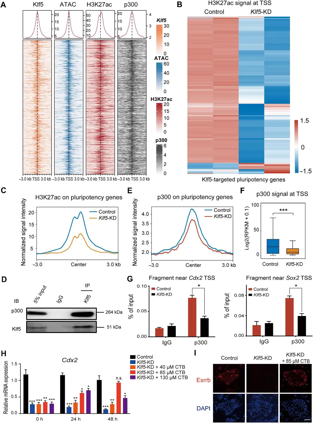 Klf5 maintains TSC-specific gene expression by recruiting p300, the acetylase of H3K27ac. (A) Heatmaps showing high chromatin accessibility and the enrichment of H3K27ac and p300 around the promoter regions of Klf5 target genes. (B) Heatmap demonstrating the change in H3K27ac signals at the TSS of Klf5 target genes in Klf5-knockdown TSCs. (C) Normalized signal intensity of H3K27ac around the promoter regions of Klf5 target genes in control and Klf5-knockdown TSCs. (D) Klf5 interactswith p300. Endogenous Klf5 was immunoprecipitated and analyzed with an antibody against p300. IgG and 5% input were used as controls. (E) Normalized signal intensity of p300 around the promoter regions of Klf5 target genes in control and Klf5-knockdown TSCs. (F) Box plot showing p300 signals at the TSS of Klf5 target genes in control and Klf5-knockdown TSCs. P-values were calculated by Mann–Whitney–Wilcoxon two-sided tests. (G) ChIP–qPCR showing p300 occupancy near the TSS of Cdx2 and Sox2. Data are presented as mean ± SD (n = 3). (H) qPCR analysis of Cdx2 in Klf5-knockdown TSCs treated with CTB at different concentrations for 0, 24, and 48 h. (I) Immunofluorescence staining of Esrrb in control and Klf5-knockdown TSCs treated with 85 μM CTB for 0 and 48 h. Scale bar, 30 μm. n.s., P > 0.05, not significant. *P < 0.05, **P < 0.01, and ***P < 0.001 by Student's t-test for comparison.