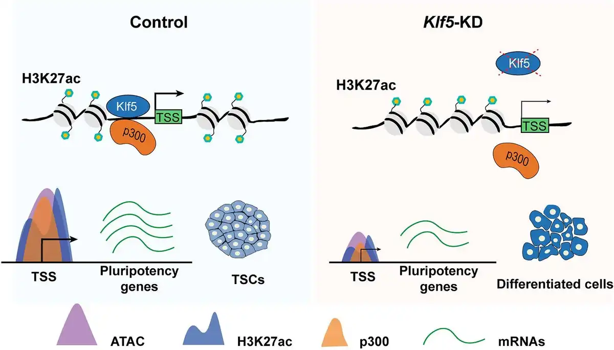 A working model showing the function of Klf5 in the maintenance of undifferentiated TSCs. Under undifferentiated TSC states, Klf5 recruits p300 to the promoter of individual pluripotency gene and maintains its open chromatin structure through H3K27ac. In Klf5-knockdown TSCs, reduced enrichment of p300 in the promoter region of specific pluripotency gene, followed by reduced enrichment of H3K27ac, suppresses chromatin accessibility and mRNA expression level of the pluripotency gene, ultimately leading to TSC differentiation.