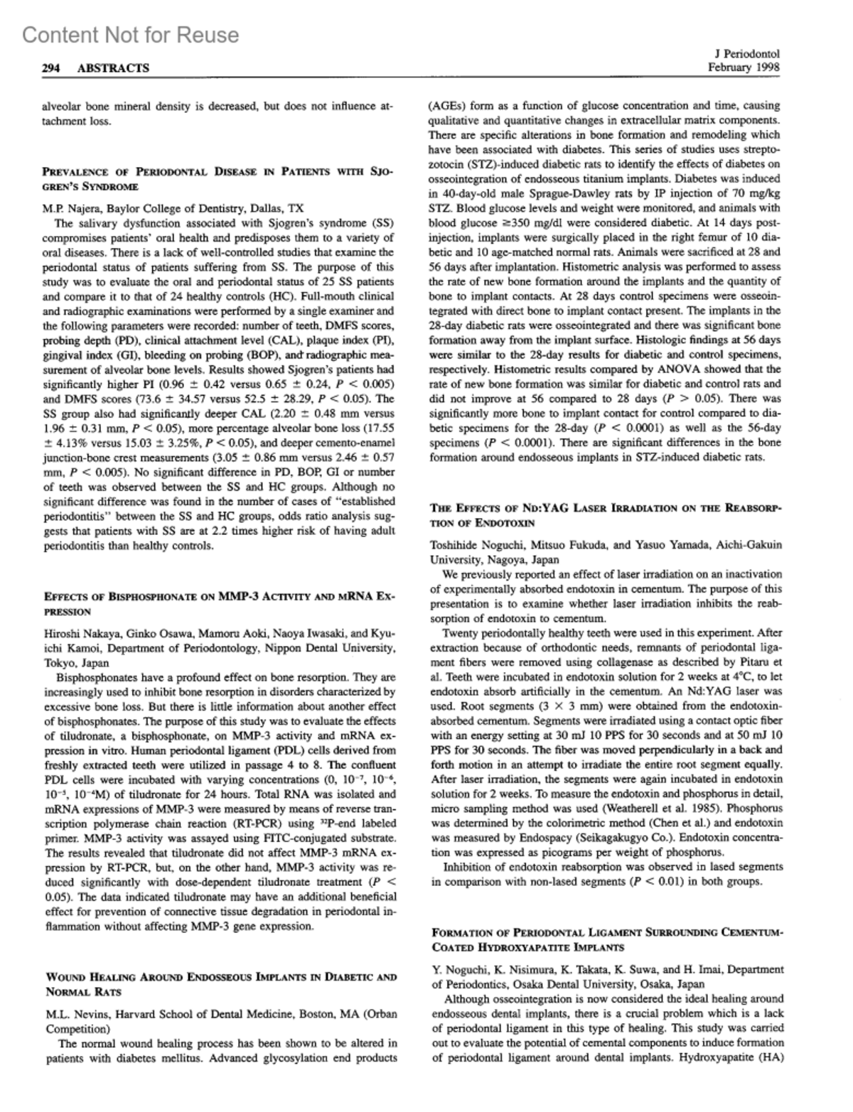 Prevalence of Periodontal Disease in Patients with Sjogren's SyndromeNajera, M. P.Author informationBaylor College of Dentistry, Dallas, TXJournal of Periodontology 69(2):p 294, February 1998.Copyright © 1998 American Academy of Periodontology