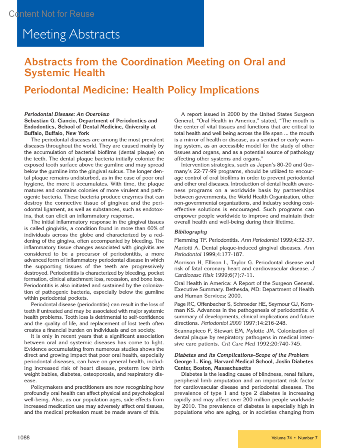 Diabetes and Its Complications-Scope of the ProblemKing, George L.Author informationGeorge L. King, Harvard Medical School, Joslin Diabetes Center, Boston, MassachusettsJournal of Periodontology 74(7):p 1088-1089, July 2003.Copyright © © 2003 American Academy of Periodontology