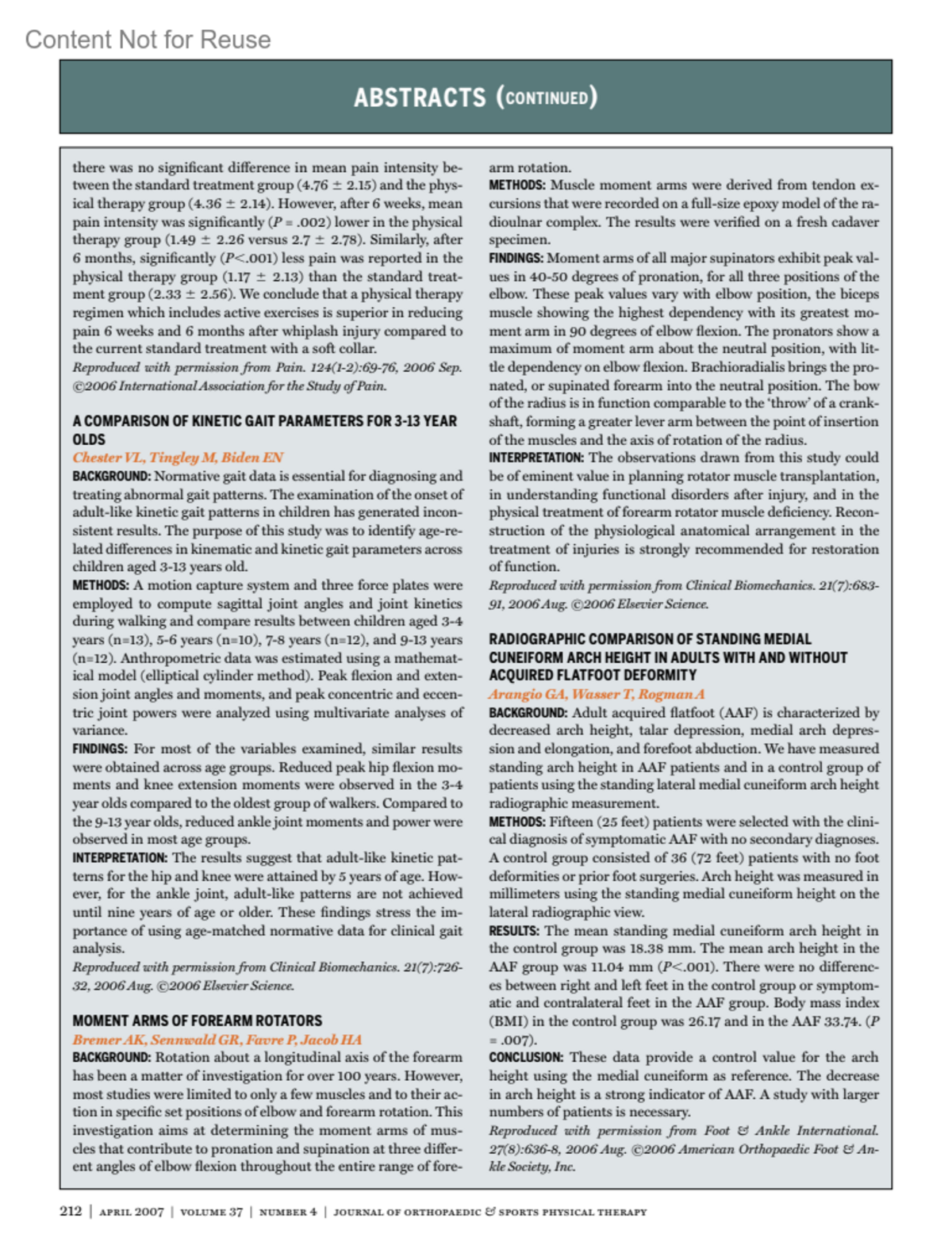 A COMPARISON OF KINETIC GAIT PARAMETERS FOR 3-13 YEAR OLDSChester, V LTingley, MBiden, E NJournal of Orthopaedic & Sports Physical Therapy 37(4):p 212, April 2007.Copyright © Copyright 2007 Journal of Orthopaedic & Sports Physical Therapy
