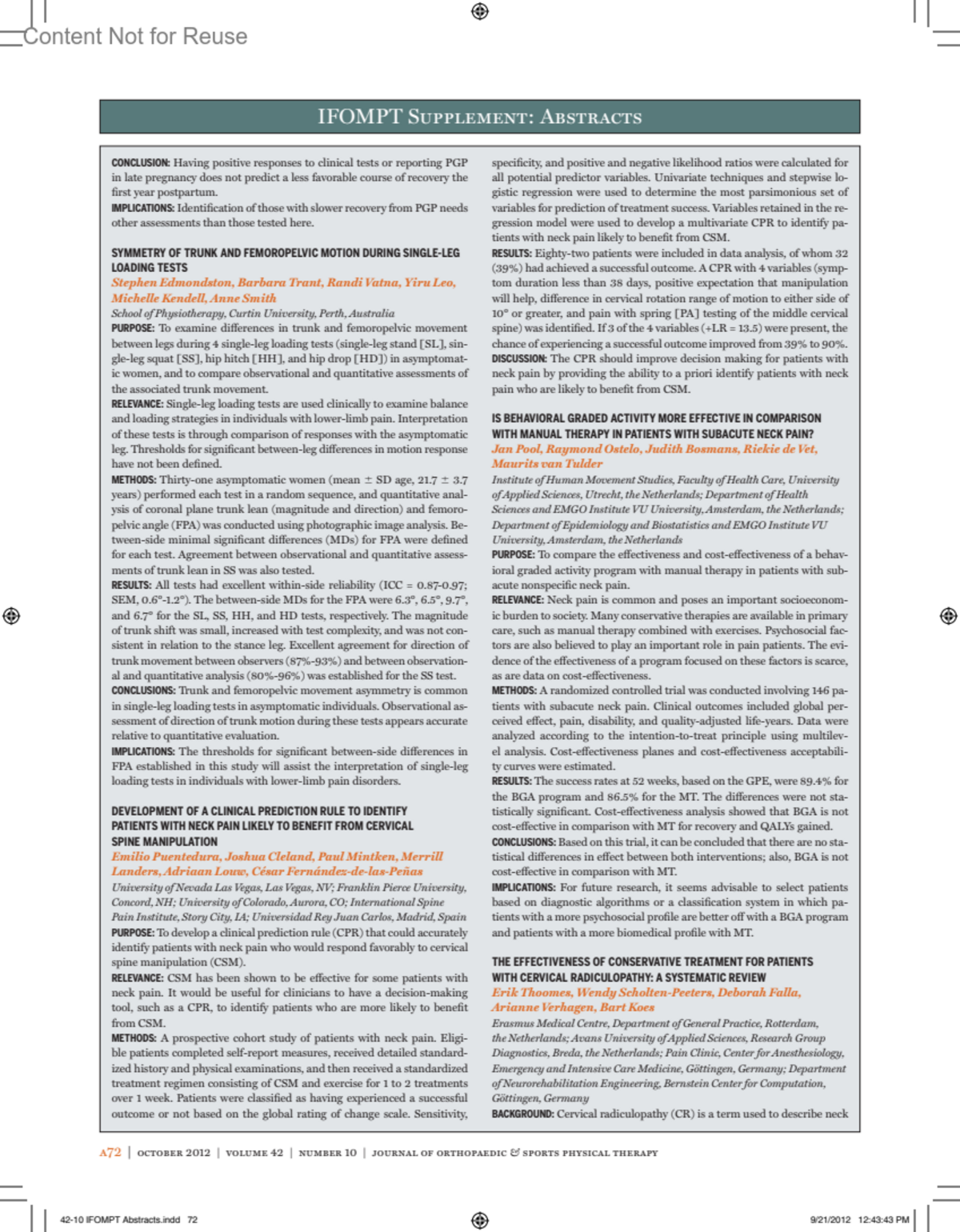 Journal of Orthopaedic & Sports Physical Therapy 42(10):p A72-A73, October 2012.