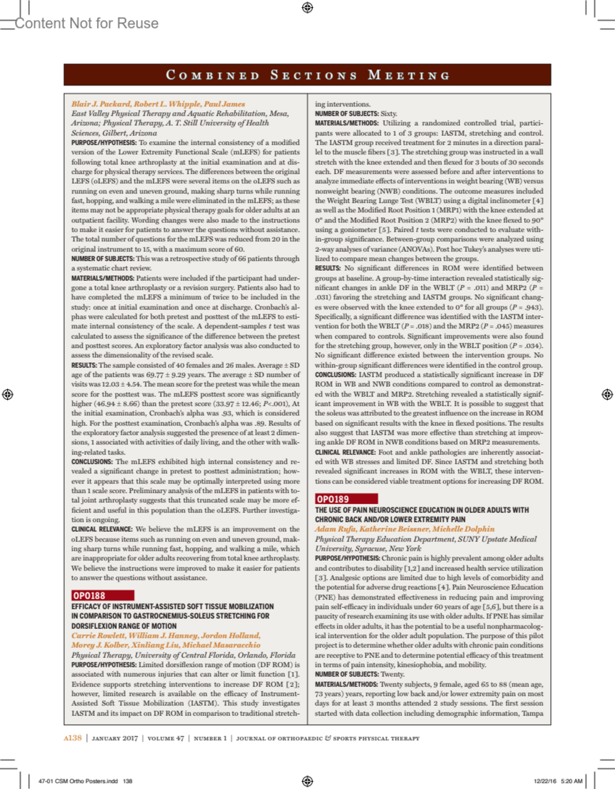 Journal of Orthopaedic & Sports Physical Therapy 47(1):p A138, January 2017.