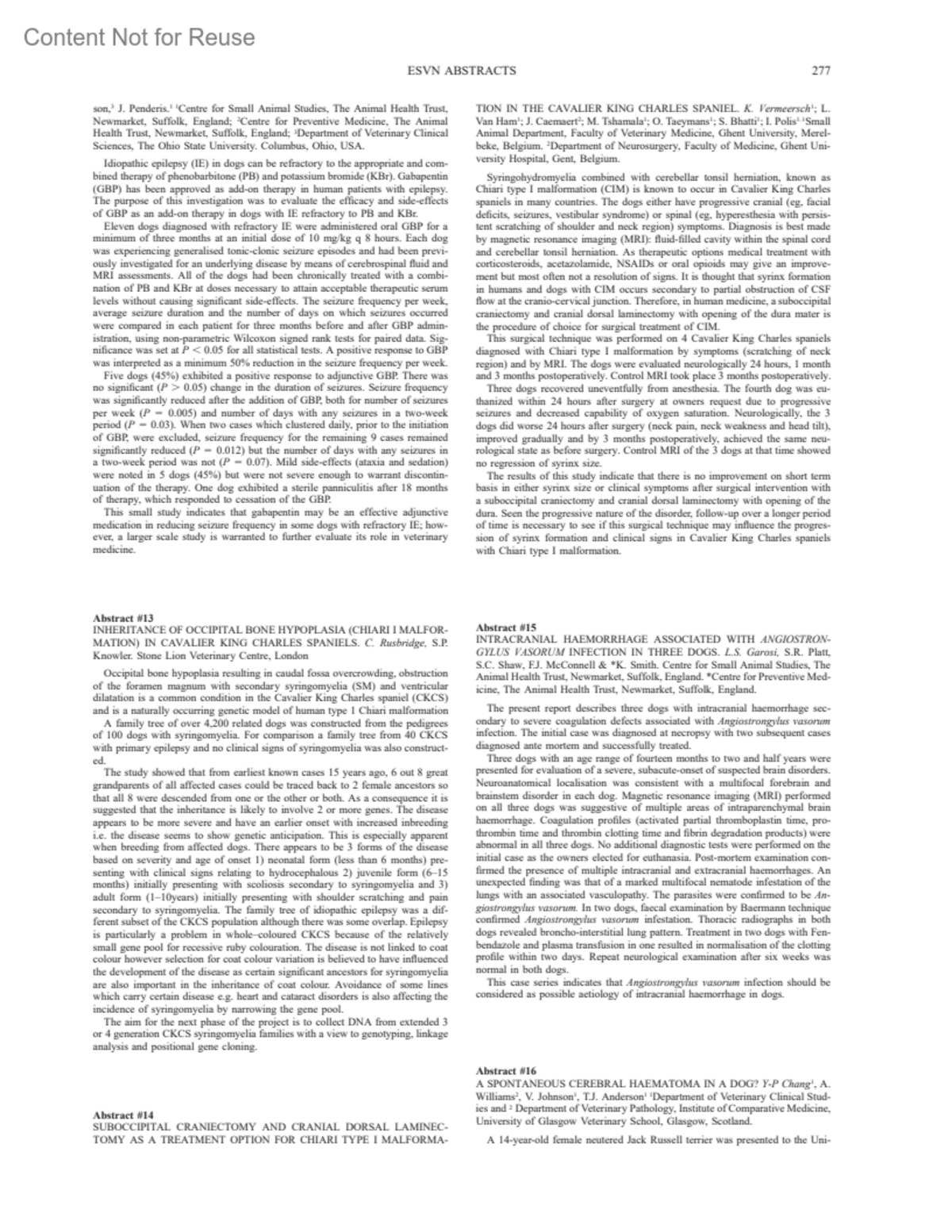 INHERITANCE OF OCCIPITAL BONE HYPOPLASIA (CHIARI I MALFORMATION) IN CAVALIER KING CHARLES SPANIELS.