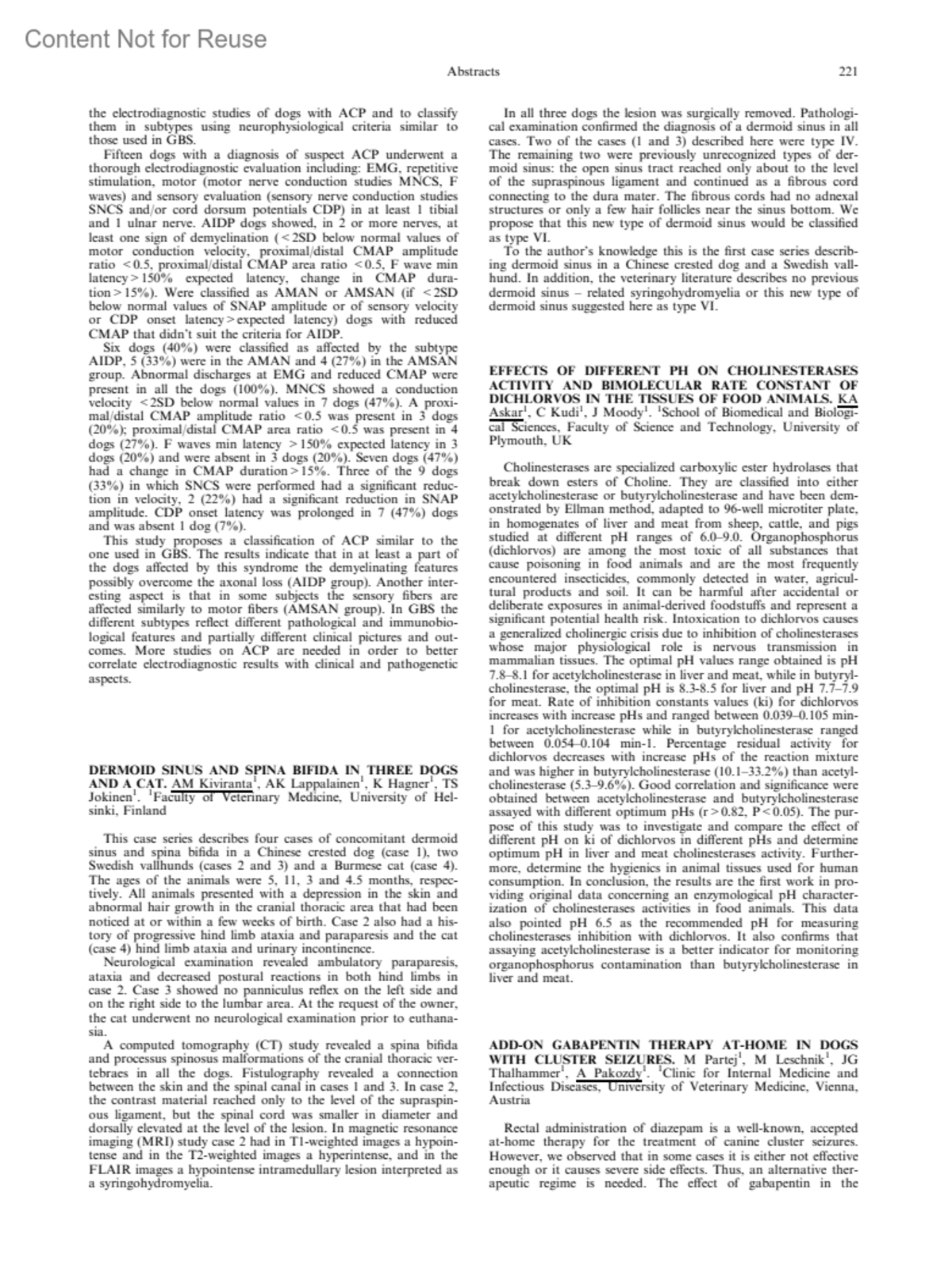 DERMOID SINUS AND SPINA BIFIDA IN THREE DOGS AND A CAT.Kiviranta, A MLappalainen, A KHagner, KJokinen, T SAuthor information1Faculty of Veterinary Medicine, University of Helsinki, FinlandJournal of Veterinary Internal Medicine 26(1):p 221, January-February 2012.Copyright © 2012 John Wiley & Sons, Inc.