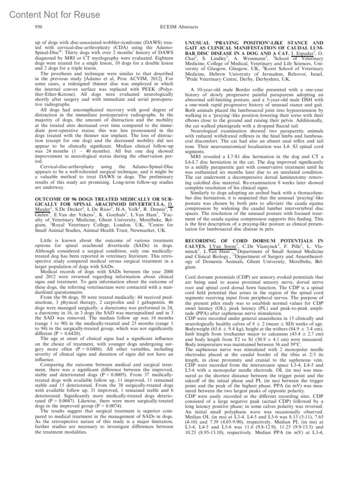RECORDING OF CORD DORSUM POTENTIALS IN CALVES.Van Soens, I.De Vlamynck, C.Pille, F.Vlaminck, L.Van Ham, L.Author information1Department of Small Animal Medicine and Clinical Biology.2Department of Surgery and Anaesthesiology of Domestic Animals, Ghent University, Merelbeke, Belgium.Journal of Veterinary Internal Medicine 28(3):p 950-951, May-June 2014.Copyright © 2014 John Wiley & Sons, Ltd