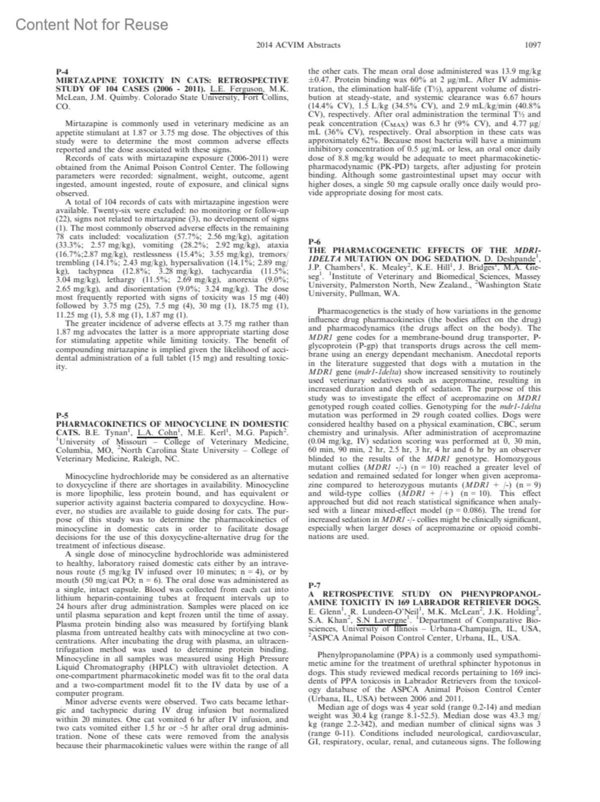 MIRTAZAPINE TOXICITY IN CATS: RETROSPECTIVE STUDY OF 104 CASES (2006 - 2011).P-4Ferguson, L. E.McLean, M. K.Quimby, J. M.Author informationColorado State University, Fort Collins, CO.Journal of Veterinary Internal Medicine 28(3):p 1097, May-June 2014.Copyright © 2014 John Wiley & Sons, Ltd