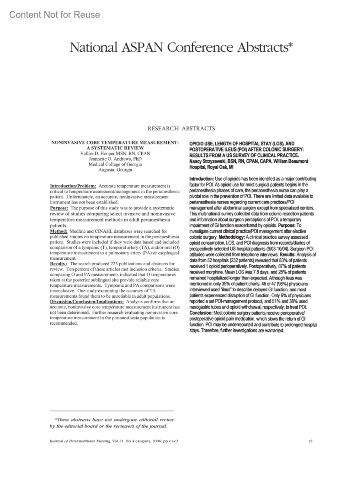 INCIDENCE OF ARRHYTHMIAS IN ASA 1 PATIENTS IN THE PHASE I PACUDaley, Kathy RN, MSN, CNS, CCRN, CPANHuffRN, Sonia MSN, CPANAuthor informationMission Hospitals Asheville, NC (Daley)North Carolina Baptist Hospital, Winston-Salem, NC (HuffRN)*These abstracts have not undergone editorial review by the editorial board or the reviewers of the journal.Journal of PeriAnesthesia Nursing 21(4):p e2, August 2006.Copyright ©2006 American Society of PeriAnesthesia Nurses