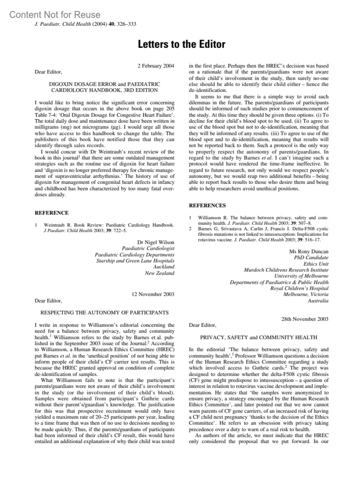 LETTER OF RESPONSE TO EDITORIAL BY R WILLIAMSON (SEPTEMBER 2003)Williamson, Professor BobAuthor informationDirector, The Murdoch Children's Research Institute, Royal Children's Hospital, Melbourne, Victoria, AustraliaJournal of Paediatrics & Child Health 40(6):p 328, May-June 2004.Copyright © 2004 Australian College of Paediatrics