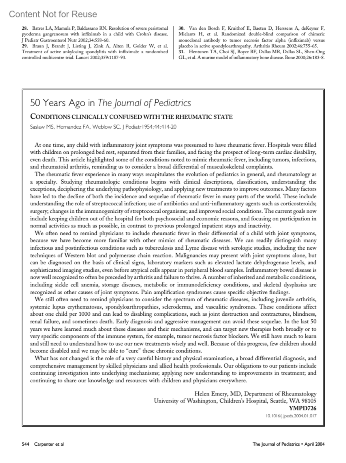 CONDITIONS CLINICALLY CONFUSED WITH THE RHEUMATIC STATEEmery, Helen MDAuthor informationDepartment of Rheumatology University of Washington, Children's Hospital, Seattle, WA 98105YMPD726Journal of Pediatrics 144(4):p 544, April 2004.Copyright © Mosby-Year Book Inc. 2004. All Rights Reserved.
